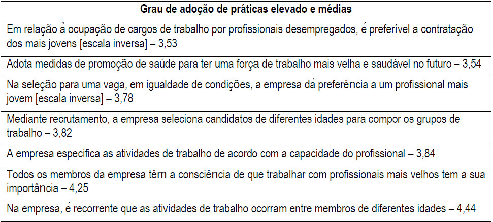 As principais práticas de gestão da idade que apresentaram algum grau de adoção pelas empresas estão associadas à conscientização dos membros da empresa com relação à importância de se trabalhar com profissionais mais velhos, especificação das atividades de trabalho de acordo com a capacidade do profissional, composição de equipes por membros de diferentes idades e seleção de candidatos de diferentes idades.