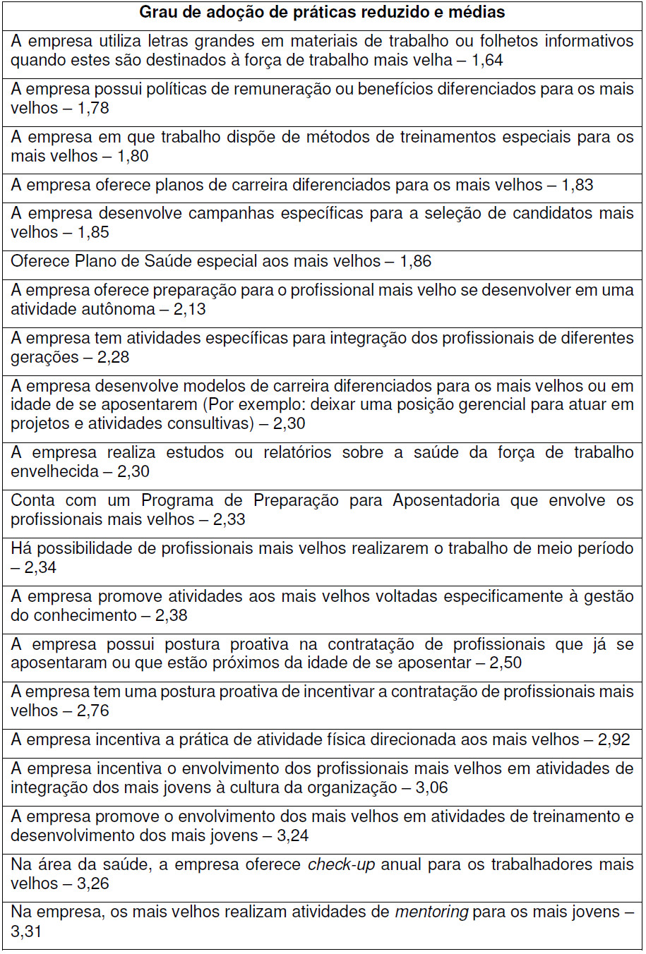 As principais práticas que não são adotadas, na visão dos gestores, estão relacionadas às práticas de ergonomia e saúde que objetivam minimizar os efeitos do envelhecimento, políticas de remuneração ou benefícios diferenciados aos mais velhos, métodos de treinamento e campanhas especiais para a seleção de candidatos mais velhos, oferta de planos de carreira diferenciados e oferta de preparação para desenvolvimento de uma atividade autônoma. Além disso, apesar dos gestores acreditarem que os mais velhos apresentem características como produtividade, confiabilidade, comprometimento e pontualidade, entre outros, notou-se que, na maior parte das vezes, as empresas não adotaram uma postura proativa na contratação destes profissionais ou que estão próximos da idade de se aposentar.