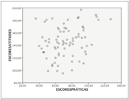 Para averiguar a relação entre os construtos Favorabilidade da Atitude (Atitude) e Intensidade de Adoção de Práticas (Práticas), foi calculado o Coeficiente de Correlação de Pearson, o qual apresentou valor 0,282, o que indica que as variáveis estão fracamente correlacionadas. A Figura 1 apresenta a dispersão dos dados.