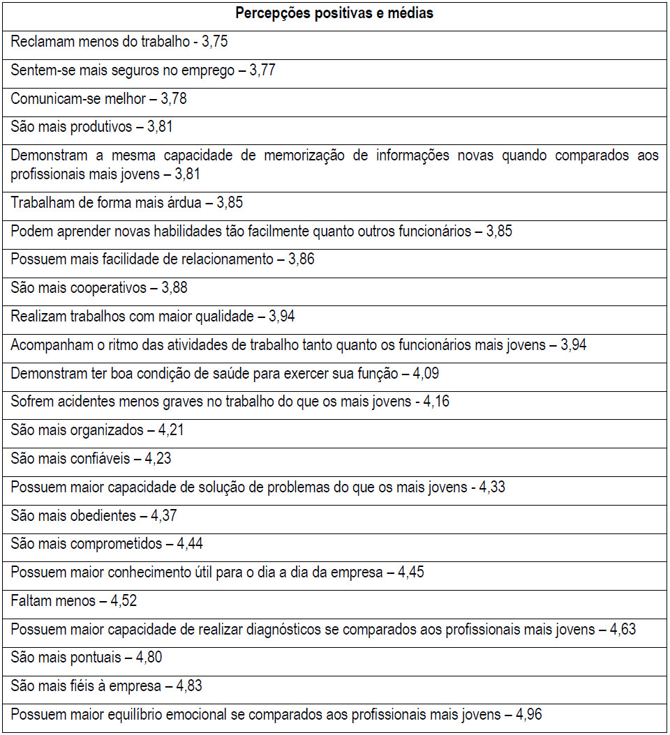 As percepções dos gestores de RH sobre os profissionais com 50 anos ou mais de idade foram investigadas a partir das médias dos itens, que possibilitaram visualizar quais as percepções são positivas ou negativas com relação àqueles profissionais. Para analisar as afirmações, considerou-se a orientação dos itens. Os itens que apresentam média entre 1,0 e 3,50 indicam percepções negativas e aqueles que apresentam média entre 3,51 e 6,0 indicam percepções positivas. O Quadro 3 apresenta as percepções positivas e o Quadro 4 apresenta as percepções negativas dos gestores.