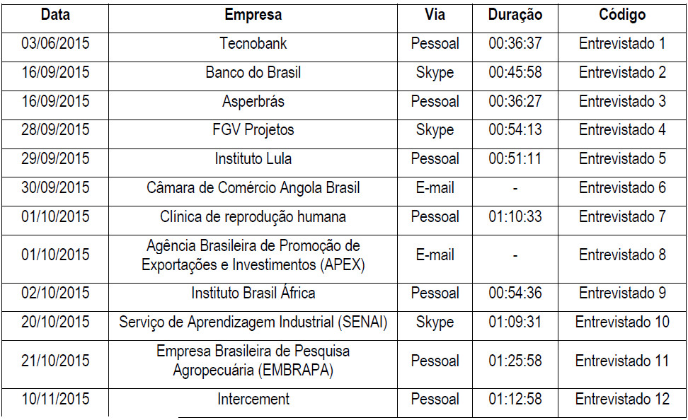 Antes de realizar a coleta de dados, foi feito um pré-teste do roteiro, no dia 1 de setembro de 2015, com um consultor independente brasileiro com experiência em países africanos, dentre os quais Angola, tendo em vista possíveis ajustes. Posteriormente, foram realizadas as entrevistas entre setembro e novembro de 2015 com representantes das unidades sociais do estudo, que são instituições brasileiras, tanto públicas como privadas, que constituem agentes relevantes na relação Brasil-Angola, conforme Quadro 1. Nesse sentido, a seleção das empresas para a composição da amostra foi por conveniência e considerou diferentes perspectivas, como o olhar privado, representado por empresas como Intercement e Clínica de reprodução humana; o olhar do governo, a partir da EMBRAPA e do Banco do Brasil; e o olhar de instituições sem fins lucrativos, como o Instituto Brasil África e o Instituto Lula.