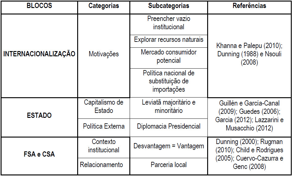 O Estado é outro fator de destaque nessa esteira das particularidades da internacionalização das multinacionais emergentes. Nas multinacionais de países como Brasil e China, o Estado representa um ator ativo, o qual fortalece as empresas no mercado doméstico e, externamente, alinhando a atuação destas com as estratégias do país (MASIERO; CASEIRO, 2012). Do mesmo modo, Peng (2012) ressalta o papel desempenhado pelos governos dos países de origem das empresas multinacionais como uma força institucional e afirma que a expansão chinesa está baseada em instituições. Enquanto a estratégia governamental chinesa é mais explícita e busca a obtenção de recursos naturais e tecnologia, no Brasil o governo é mais discreto e tende a estimular as indústrias já consolidadas e com maior potencial competitivo no cenário internacional (MASIERO; CASEIRO, 2012). Para Lazzarini e Musacchio (2012), os chamados BRIC (Brasil, Rússia, Índia e China) possuem um mix de participação do Estado, ou seja, existe leviatã minoritário e leviatã majoritário. No Brasil o leviatã minoritário é o mais praticado e via agentes institucionais. Por exemplo, o BNDES ofereceu linhas de crédito para investimentos de longo prazo e representou o principal instrumento fomentador da formação de grandes conglomerados de empresas brasileiras voltados para a internacionalização (GUEDES, 2006; CERVO; BUENO, 2011).