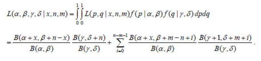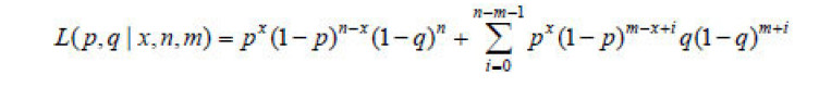 Conjugando as características do modelo BG/BB para um cliente com um fluxo passado de operações determinado pelo número x de operações durante um período de n oportunidades de transação e última transação na oportunidade m-th, a probabilidade de p e q é dada por