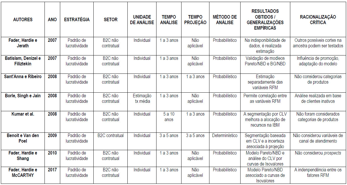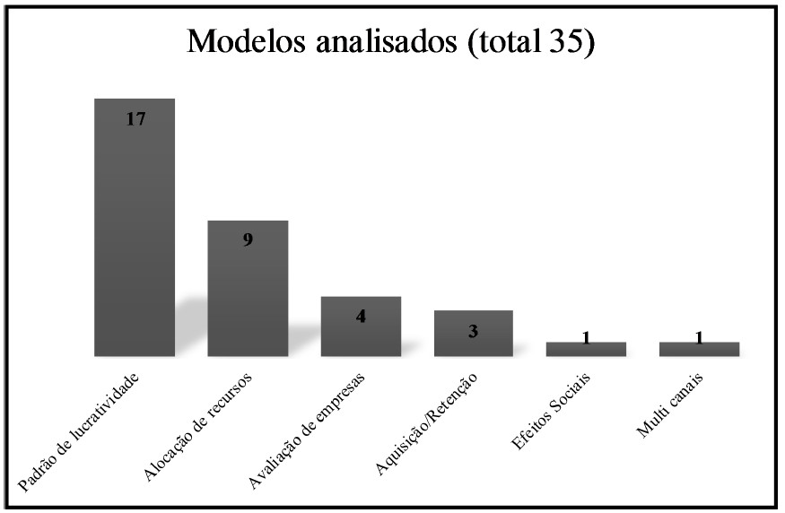 Uma vez que prospectar novos clientes é mais caro do que manter os atuais ativos (KOTLER, 2000; RUST; ZEITHAML; LEMON, 2001; KUMAR; PETERSEN, 2005; GUPTA; LEHMANN, 2006), as firmas buscam identificar e analisar quais clientes são mais lucrativos, orientando para investimentos em retenção. Conforme Quadro 4, do total de 35 modelos, 17 modelos foram identificados e classificados sob a principal abordagem de análise dos padrões de lucratividade.