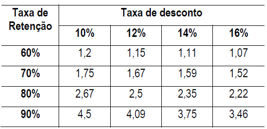 [equação 6]Da equação 6, Gupta e Lehmann (2006) calcularam os múltiplos da margem m, considerando valores de retenção de 60%, 70%, 80% e 90% e taxas de desconto de 10%, 12%, 14% e 16%, conforme Tabela 1: