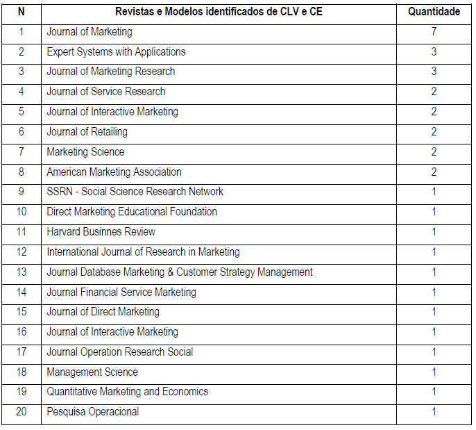 Os modelos empíricos provieram de 20 (vinte) revistas diferentes. Da revista “Journal of Marketing” foram identificados 7 (sete) modelos; da revista “Expert System with Application” e do “Journal of Marketing Research” foram identificados 3 (três) modelos e assim por diante, conforme Quadro 1. Notou-se que a concentração de modelos se deu em pesquisa no campo de marketing interativo e marketing de serviços, reforçando a descrição de Berger e Nasr (1998), Singh e Jain (2002), Gupta e Lehmann (2003), Nenonen e Storbacka (2008), de que o campo de pesquisa sobre o valor econômico de cliente apresentou origem no desenvolvimento do marketing de serviços em campanhas de marketing direto e tem se limitado ao domínio do marketing.