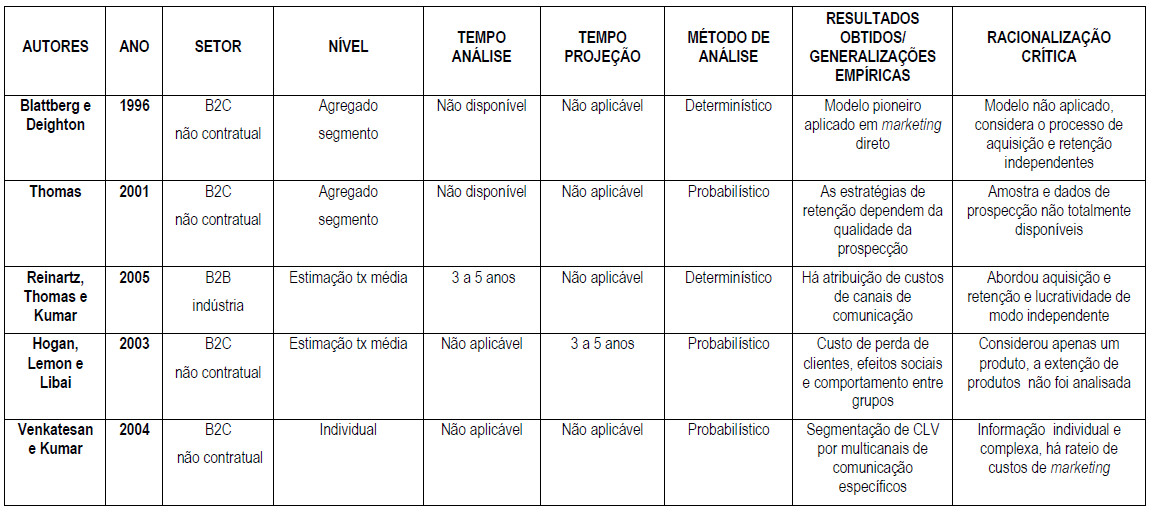 Dados os diferentes contextos das firmas atuais, os modelos têm apresentado diferentes abordagens a cada realidade (BERGER et al., 2006; BERGER; NASR, 1998; BICK, 2006; JAIN; SINGH, 2002; KUMAR; GEORGE, 2007; WIERENGA, 2008). Pôde-se identificar (5) cinco eixos de líderes autores que fundamentaram a trajetória histórica desta linha de pesquisa: (1) Blattberg e colegas (1996, 2001); (2) Rust, Zeithaml & Lemon (2001, 2004); (3) Gupta e colegas (2003, 2004 e 2006); (4) Kumar e colegas (2004, 2006, 2008 e 2009); (5) Fader & Hardie e colegas (2005b, 2007, 2010a, 2010b e 2016).