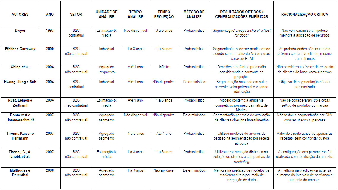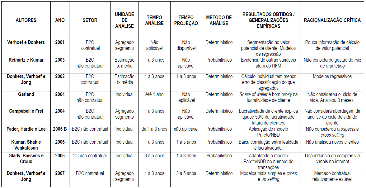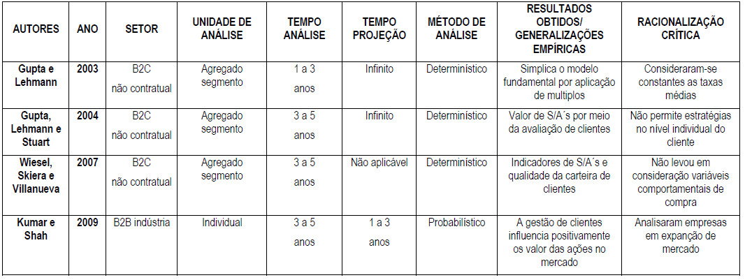 Embora os modelos que avaliam o ciclo de vida do cliente precisassem projetar o valor do cliente por toda a vida, os modelos adotam um horizonte de projeção de três (3) anos, pois consideram uma relativa estabilidade para ações de marketing. Permite constatar que poucos modelos se atentatarm pela realidade dinâmica da tomada de decisão dos gerentes, com exceção de Tirenni et al. (2007), que desenvolveram uma estrutura flexível para o cálculo do CLV a qualquer tempo. As pesquisas mais recentes relacionam o valor do cliente à capitalização de mercado.