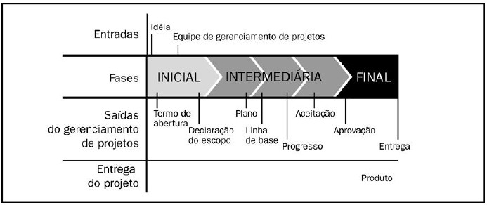 No que tange ao ciclo de vida em projetos, Verzuh (1999) propõe uma estruturação dos projetos por meio dos processos: definição, planejamento, execução e encerramento. Estes processos se repetem ao longo dos vários estágios do ciclo de vida do projeto (ver Figura 1). Maximiano (2002) também compartilha deste pensamento ao afirmar que os processos da administração de projetos – planejamento, organização, execução e controle – são necessários para todos o projeto e para cada fase do seu ciclo de vida. O PMI (2013), por sua vez, propõe 47 processos para o gerenciamento de projetos, agrupados em cinco grupos de processos. Esses cinco grupos de processos são: Iniciação, Planejamento, Execução, Monitoramento e Controle e Encerramento.