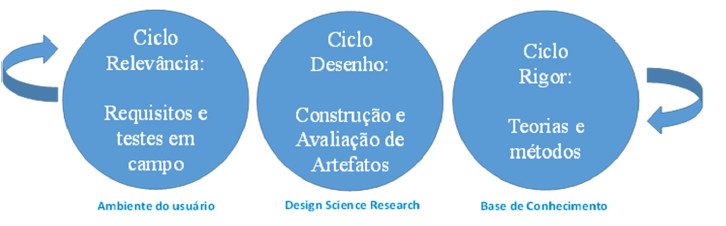 O ciclo de relevância inicia com uma aplicação que não só fornece os requisitos para a pesquisa (por exemplo, a oportunidade ou problema a ser abordado) como entradas, e também define critérios de aceitação para a avaliação final dos resultados da investigação. É relevante para o usuário assegurar que o artefato pode melhorar o seu ambiente e como isso poderá ser medido, bem como se o estudo de campo do artefato pode ser executado por meio de métodos de transferência de tecnologia apropriada (HEVNER, 2007). O ciclo de desenho do artefato considera a construção de um artefato, a sua avaliação e o feedback posterior para refiná-lo ainda mais. Durante a execução do ciclo de criação, é importante manter um equilíbrio entre os esforços despendidos na construção e na avaliação da evolução do artefato desenhado. Ambas as atividades devem ser convincentes e baseadas em relevância e rigor. Havendo um argumento forte para a construção do artefato, é insuficiente se a avaliação subsequente for fraca. Já em relação ao ciclo de rigor, Hevner (2007) explica que este fornece conhecimento passado para o projeto de pesquisa para assegurar a sua inovação. Depende dos pesquisadores uma pesquisa aprofundada que referencie a base de conhecimento, a fim de garantir que os desenhos produzidos sejam contribuições da pesquisa. Rigor na pesquisa baseia-se na seleção e na aplicação das teorias e dos métodos adequados para a construção e avaliação do artefato. Adições à base de conhecimento como resultados de pesquisa devem incluir todas as extensões para as teorias e métodos originais feitos durante a pesquisa, novos meta-artefatos (produtos de design e processos) e experiências adquiridas com a realização da pesquisa de campo e teste do artefato no ambiente de aplicação.