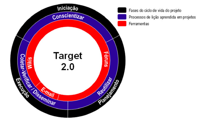 A parte superior do Target apresenta as fases do ciclo de vida do projeto. Para cada fase, podem ser utilizados os processos de lições aprendidas, e abaixo de cada fase é evidenciada a ordem de priorização de cada processo. A ordem de priorização sugere quais processos seriam mais indicados em determinada fase, em ordem de importância para sua aplicação. Quanto à gestão de projetos, o Target apresenta os processos de forma que estes possam ser utilizados em qualquer fase do ciclo de vida do projeto, evitando que a GLA seja inflexível e sugerindo que os diversos processos possam acontecer em qualquer momento do projeto (ROSA et al., 2016).