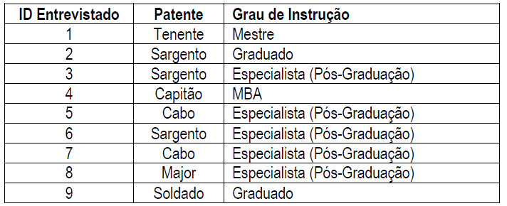 O artefato Target foi validado na área de projetos de uma instituição governamental de segurança pública. Essa área de projetos é constituída por profissionais com formação superior e com experiência em gestão de projetos que atuam, em sua maioria, há mais de 5 anos na área. A Tabela 1 apresenta a qualificação dos entrevistados. Em quase sua totalidade a área é composta por Oficiais (Tenentes, Capitães, Majores e um Tenente-Coronel que é responsável pela área de projetos), mas também há Praças (Cabos e soldados), que promovem a gestão de projetos com a mesma qualificação.