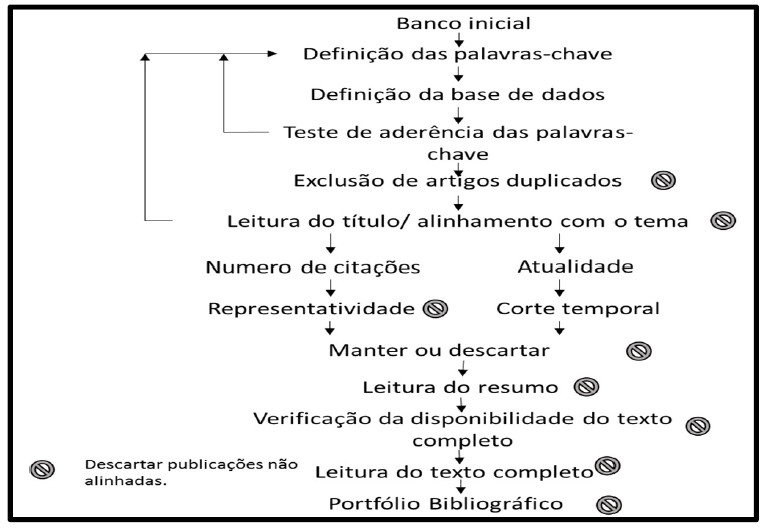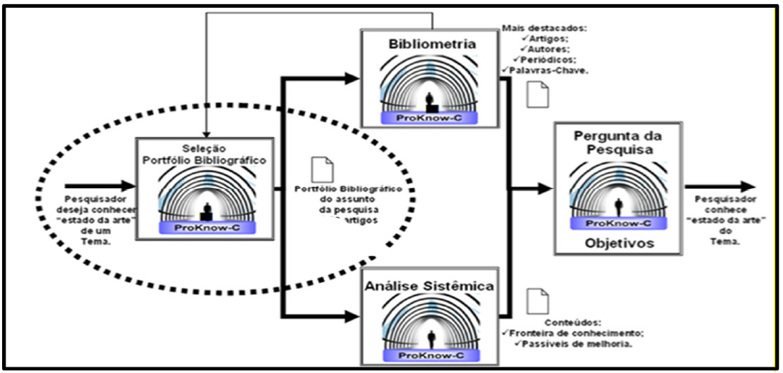 O ProKnow-C envolve as seguintes etapas: (a) Seleção do portfólio bibliográfico - compilação de publicações com reconhecimento científico e proeminência, com título, conteúdo do resumo e conteúdo completo alinhado ao tema de estudo de acordo com a percepção e os limites do investigador; (b) Bibliometria - divulgação quantitativa do processo de coleta de dados estatísticos do conjunto de artigos (portfólio bibliográfico) para a gestão da informação e do conhecimento científico sobre o assunto; (c) Análise Sistêmica - análise de uma amostra representativa de itens de uma determinada pesquisa, visando evidenciar os destaques e as lacunas teóricas encontradas para cada conceito.