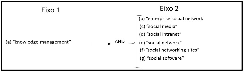 Uma pesquisa não estruturada foi realizada por títulos vinculados ao tópico “GC e MS” na ferramenta Google Acadêmico. Os artigos sobre o tema foram selecionados e as palavras-chave relacionadas ao assunto foram identificadas. Foram selecionadas as seguintes palavras-chave: gestão do conhecimento, redes sociais empresariais; mídias sociais, intranet social, rede social, sites de redes sociais, software social. Para realizar a busca por artigos no banco de dados, foi necessário usar combinações de palavras-chave (Figura 3).