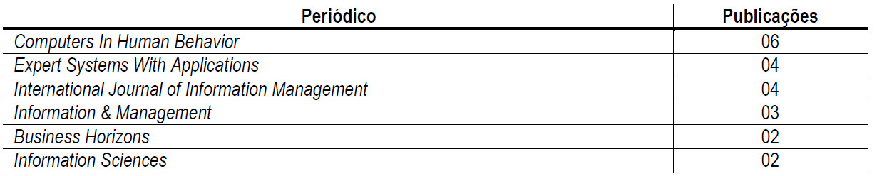 Computers in Human Behavior aparece em primeiro lugar com 06 publicações. Expert Systems with Applications e International Journal of Information Management estão em segundo lugar com 04 publicações cada um. Business Horizons e Information Sciences com 02 publicações estão em terceiro lugar. Estes resultados demonstram que a maioria das publicações está concentrada em algumas revistas. Os principais periódicos investigam questões relacionadas ao comportamento humano, computadores, aplicação de sistemas e gerenciamento de informações. Esta constatação aponta para o alinhamento do tema nas revistas mais relevantes quanto ao número de publicações.