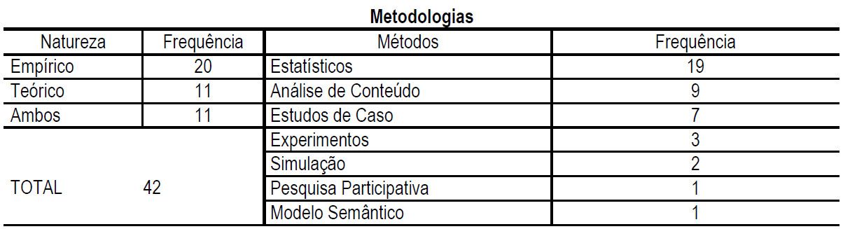 A Tabela 2 mostra que foram encontrados 20 estudos empíricos, ou seja, cerca de 48%, bem como 11 artigos teóricos e empíricos, com cerca de 26% e 26% de estudos teóricos. Portanto, há uma lacuna de artigos teóricos sobre “GC” e “MS”. Métodos de estatísticos compreendem 45%; seguidos de análise de conteúdo, com cerca de 21%, e estudos de caso, com cerca de 17% do total. Os outros métodos apresentam uma frequência entre 7% e 2%. Métodos quantitativos são os mais utilizados para estudar “GC e MS”. Portanto, existem lacunas para realizar mais pesquisas com estudos qualitativos e métodos mistos.