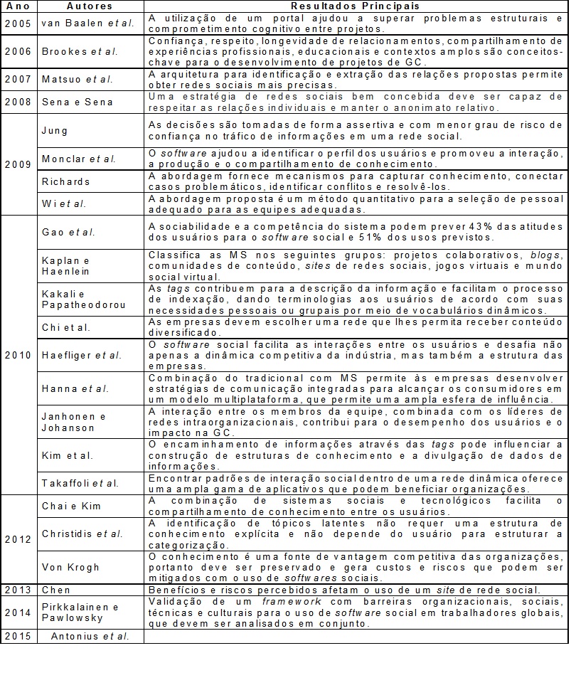 Pode-se observar que os resultados encontrados nos estudos mencionam, em síntese, os seguintes elementos: (a) soluções, novas ideias para projetos de GC e formação de equipes; (b) conceitos-chave em projetos de GC; (c) melhoria dos processos de tomada de decisão por meio da aquisição do conhecimento sobre produtos e clientes nas MS; (d) maior confiança na informação; (e) categorização e formação de estruturas de conhecimento; (f) softwares sociais baseados em novas tecnologias como facilitadores do compartilhamento do conhecimento e fonte de vantagem competitiva das corporações; (g) utilização combinadas das mídias tradicionais e MS para melhorar a comunicação e o compartilhamento de conhecimento nas corporações, (h) falta de novas competências dos utilizadores para tirar pleno proveito das redes sociais e mídias virtuais, (i) complexidade das MS tem efeito decrescente no compartilhamento e na continuidade do uso; e (j) necessidade de facilidade de acesso e uso das ferramentas de MS para a GC.