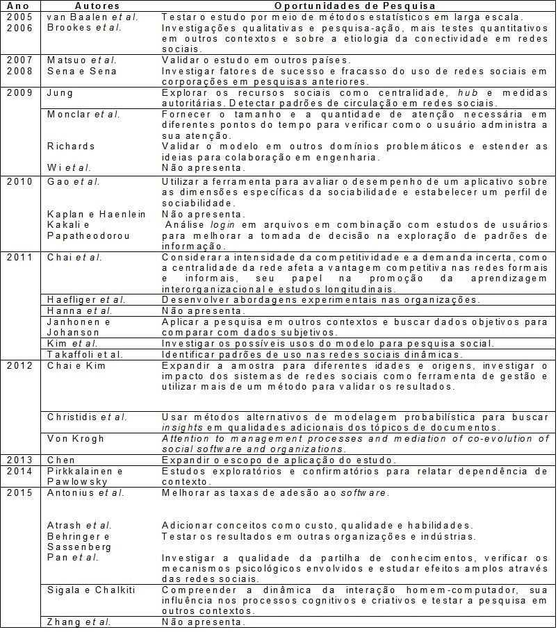 As oportunidades de pesquisa indicam pontos específicos para o desenvolvimento do contexto, aplicação de novas metodologias, tipos de dados, escopo, tempo, população e aprofundamento dos estudos. A identificação das razões para a descontinuidade do uso das MS para fins corporativos e a busca por ferramentas simples e úteis são alternativas pouco exploradas. A influência positiva e negativa de aspectos comportamentais e psicológicos sobre os usuários também precisa ser mais bem investigada. Para pesquisas futuras, sugerem-se novos estudos sobre a influência dos ambientes interno e externo das corporações que usam MS para apoiar a GC como fonte de vantagem competitiva.