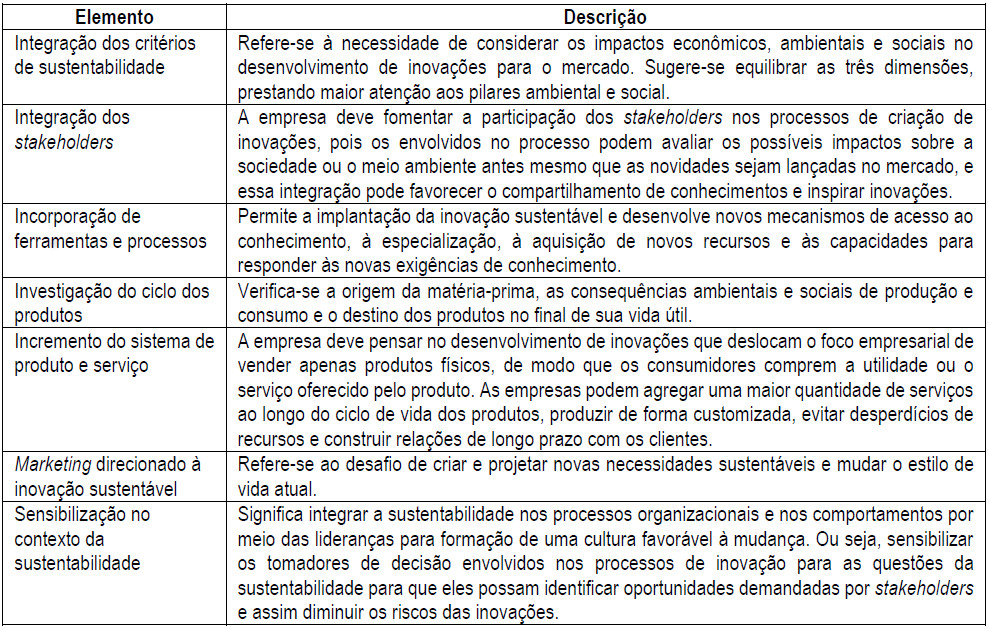 Hansen, Grosse-Dunker e Reichwald (2009) criaram o modelo do cubo da inovação orientada para sustentabilidade, que trata de um framework para a inovação, destacando os efeitos da sustentabilidade em diferentes áreas da organização. O modelo apresenta alguns elementos que os autores consideram importantes para inovação orientada para sustentabilidade, destacados no Quadro 1.