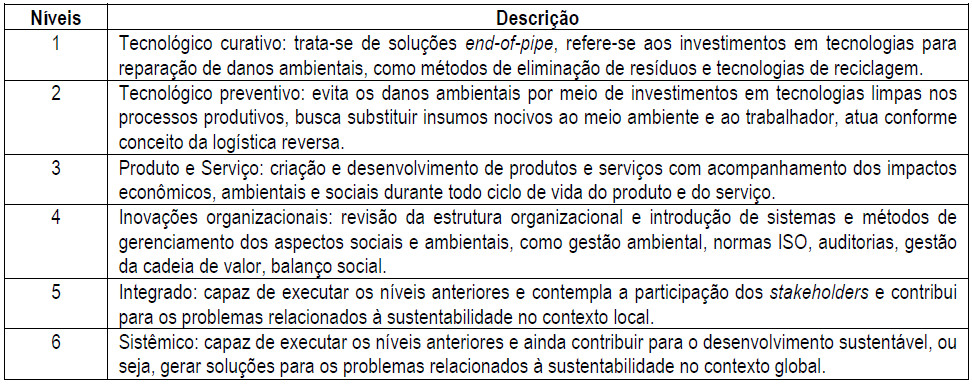 O Quadro 2 destaca níveis diferentes de inovação sustentável nas organizações considerando o nível de maturidade com que as organizações tratam do tema. Dessa forma, é possível se pensar em inovação sustentável em sua forma inicial, caracterizada pela correção de problemas com base em exigências legais, que podem ser classificadas no nível 1 de inovação sustentável. As organizações que, além de corrigir, atuam na prevenção, classificam-se no nível 2 e assim sucessivamente. Finalmente, as organizações que possuem ações globais de inovação sustentável atuam no nível 6. Dessa forma, existe um efeito cumulativo implícito no nível de desenvolvimento da inovação sustentável.