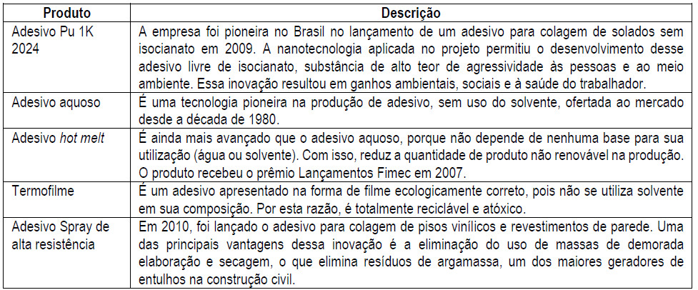 Além disso, na mesma década, a empresa passou a produzir o adesivo hot melt, que também possui apelo ecológico, pois é isento de solvente, para isso estabeleceu uma parceria para licenciamento de tecnologia firmado com a Forbo (Suíça). Em 2004, a empresa, representante exclusiva da francesa Protechnic, apresentou ao Brasil a tecnologia de adesivos termofilmes, que permite a aplicação uniforme do adesivo e em quantidades mínimas sem desperdícios, por meio de processos mecanizados de prensagem e aquecimento. Além disso, o produto é inteiramente reciclável, não contém solvente e, assim, não libera gases tóxicos. A última inovação sustentável nesse segmento se trata do adesivo em pó, sem solvente e sem água, viabilizada com a aliança firmada com uma empresa fabricante de máquinas (MENONI, 2008; BALANÇO SOCIAL, 2012). Sendo assim, conforme o entrevistado 3, “isso mostra que a empresa busca negócios sustentáveis e tem esse perfil de buscar a renovação de projetos, de buscar inovação contínua em nível de tecnologia para que seja em conjunto com a premissa de seus valores”.
