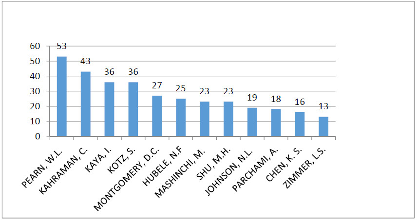 Análise similar foi realizada nas referências do PB, onde se observou que Wen Lea Pearn e Kahraman são os destaques, seguidos de Kaya, I. e Kotz, S. A Figura 4 apresenta a quantidade de publicações por autor constantes das referências bibliográficas do PB.