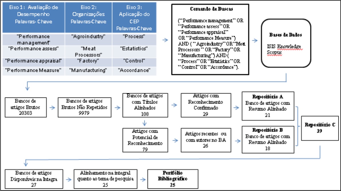 A aplicação do processo ProKnow-C abrange a seleção de um portfólio bibliográfico- PB relevante e alinhado ao tema pesquisado e, a partir deste, a realização de sua análise bibliométrica. Para a seleção do PB, o ProKnow-C inicia com a definição da composição do tema. Esta composição é realizada pela especificação dos assuntos que, no entender dos pesquisadores, explicam em forma exaustiva o tema a ser pesquisado. A estes assuntos o ProKnow-C chama de eixos. Para a presente pesquisa, o tema é gestão de CEP e os eixos utilizados são: Avaliação de Desempenho; Organizações e CEP. A seguir, o ProKnow-C requer que, para cada eixo, sejam definidas suas palavras-chave e a combinação das mesmas para o processo de busca. A etapa seguinte é a de definir as bases de dados onde será realizada a busca, seguindo-se a busca propriamente dita.