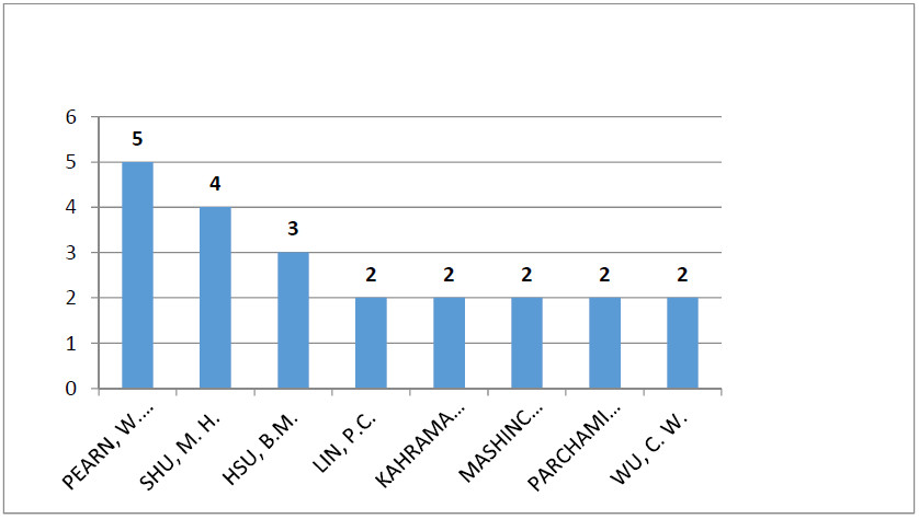 Na análise do PB, foi possível identificar 50 autores, destes 8 apresentam mais que uma publicação no PB. Os autores com maior participação em publicações são: Wen Lea Pearn, PhD, Professor na University of Maryland, com 5 publicações de periódicos; Shu-Ming Chung, PhD, Professor na The University of Tokyo, com 4 publicações; e Bi-Min Hsu, do Departament of Industrial Engineering and Management of University Taiwan, com 3 periódicos. A Figura 3 apresenta a quantidade de publicações dos autores.