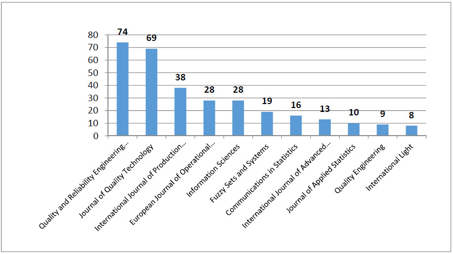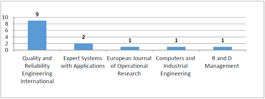 Já em relação aos periódicos científicos responsáveis pelas divulgações das pesquisas, destacam-se: Quality and Reliability Engineering International, apresentando 9 publicações, seguido da Expert Systems With Applications com duas.