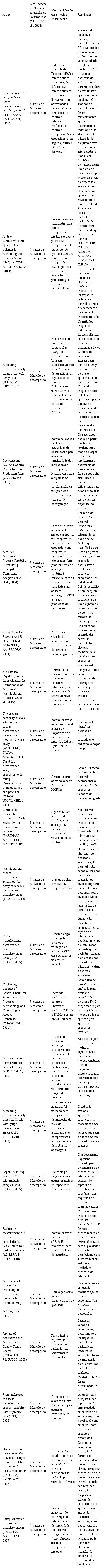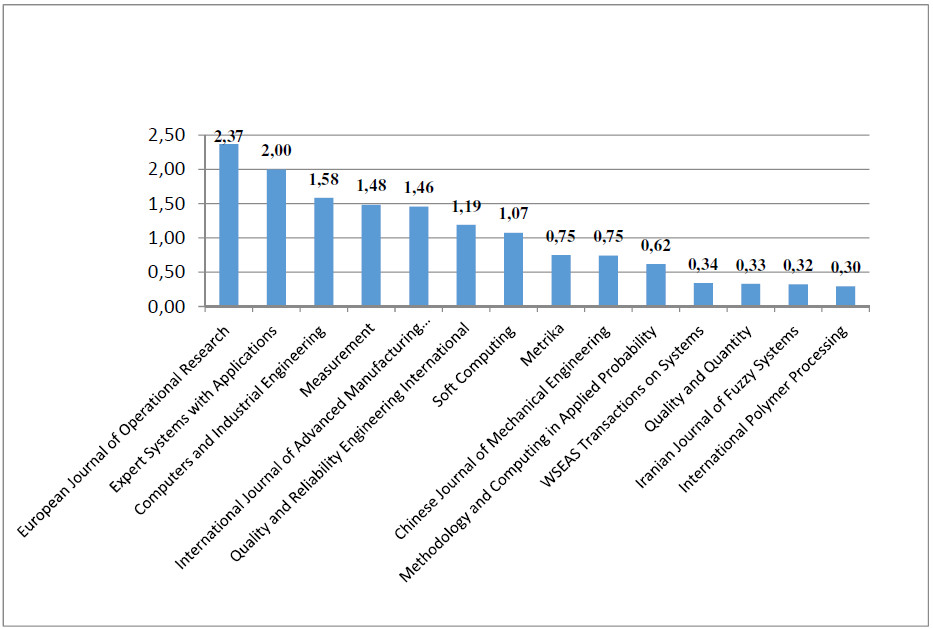 Os periódicos em destaque, identificados quanto ao fator de impacto foram: European Jounal of Operational Research (2,37); Expert Systems with Applications (2,00); Computers and Industrial Engeering (1,58); Measurament (1,48); International Journal of Advanced Manufacturing Technology (1,46); Quality and Reliability Engineering International (1,19) ; Soft Computing (1,07).