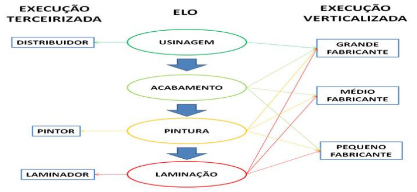 Verificou-se ainda um desacoplamento dos elos em relação aos fabricantes, principalmente ligados ao volume de produção, ou seja, a maior concentração da terceirização dos elos se dá nos menores fabricantes. A Figura 1 mostra que o elo usinagem é realizado pelos distribuidores e grandes fabricantes. Isso é explicado pelo volume de produção e maior capacidade financeira para adoção da tecnologia mais avançada. Quando analisado o elo acabamento, nota-se que o mesmo está vinculado somente aos fabricantes. Isso se explica pelo fato de que o acabamento é feito essencialmente pelo shaper que projetou o modelo. Conforme já mencionado, eles estão inseridos em todos os portes de fabricantes.