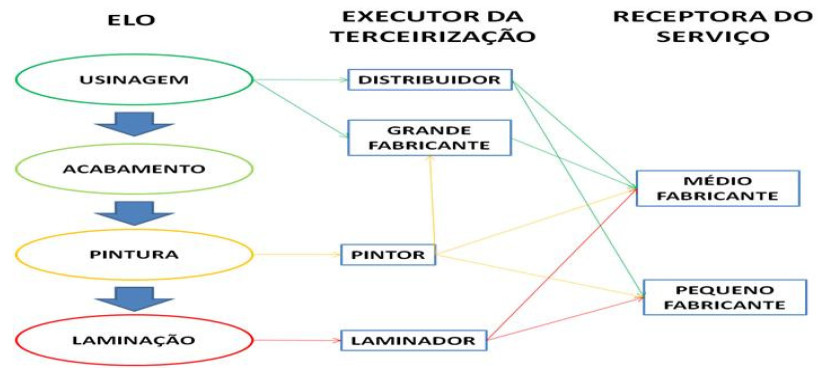 Foi possível constatar ainda que as maiores demandas por serviços terceirizados estão concentradas nas pequenas e médias empresas, mas o suprimento desta demanda é distribuído por diferentes atores, dependendo do elo analisado. Quando examinado o elo usinagem, verifica-se que está sob domínio dos grandes distribuidores e grandes fabricantes. Percebe-se ainda que os grandes fabricantes, quando da terceirização do serviço de usinagem, tendem a prestá-lo a médias empresas, otimizando o serviço em relação ao volume de produção com poucos clientes.