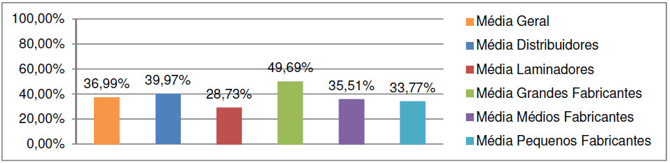 Nota-se quanto aos médios e aos pequenos fabricantes que as médias na avaliação de desempenho se situaram entre 33,77% e 35,51%. Esta situação pode ser explicada pelas similaridades de atividades executadas pelos atores. Apesar de todos os médios fabricantes e de 50% dos amostrados da categoria dos pequenos verticalizarem os processos de acabamento, pintura e laminação, potencializando a produção de resíduos, estes acabam se beneficiando na avaliação por estarem legalmente enquadrados quanto a emissões atmosféricas. A pequena variação para os outros 50% da amostra dos pequenos fabricantes se dá pelo impacto negativo, por não atenderem às normas para eliminação dos resíduos sólidos.