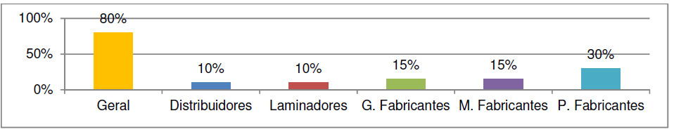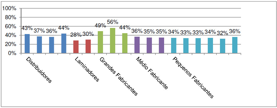 Para o desempenho ambiental, na totalidade da amostra, pode-se observar nas categorias laminadores e médios fabricantes que a diferença no resultado da avaliação entre os amostrados não chega a 2%. Isso se explica pela similaridade das estruturas e das atividades executadas por cada categoria. Quanto à análise dos pequenos fabricantes, foi constatada uma diferença de 4 a 5 pontos percentuais entre os resultados da avaliação de desempenho, sendo que há uma polarização em 32% e 36%. O fator para essa diferença é possivelmente a questão da terceirização dos elos por parte dos atores com melhor desempenho.