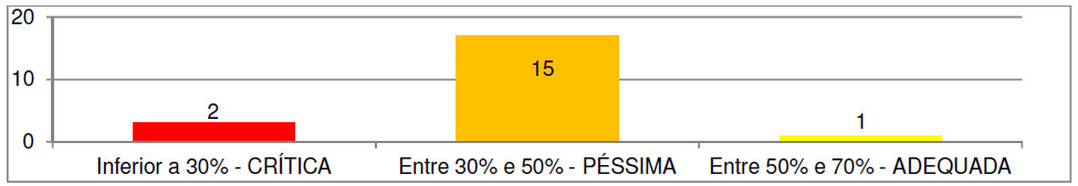 O Gráfico 1 apresenta o índice geral de desempenho ambiental para toda a amostra, que foi de 36,99%, que conforme a classificação de desempenho ambiental da LVSO, é considerado “péssimo”, uma vez que se situa abaixo dos 50%, que configura a classe “adequado”.