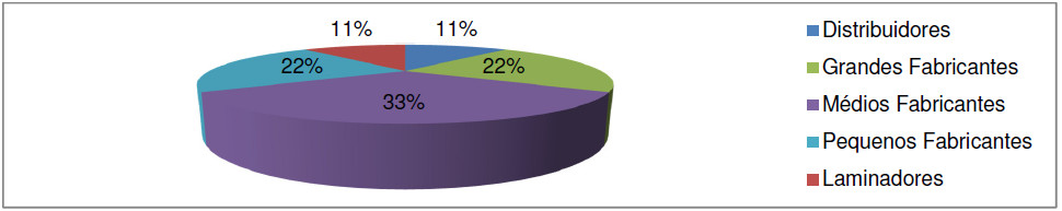 Os fabricantes foram divididos em três categorias: pequenos, médios e grandes. O critério para segmentação do tamanho das empresas foi vinculado ao número de colaboradores: grandes, com mais de seis colaboradores; médias, de três a cinco colaboradores; e pequenas, com menos de três colaboradores.