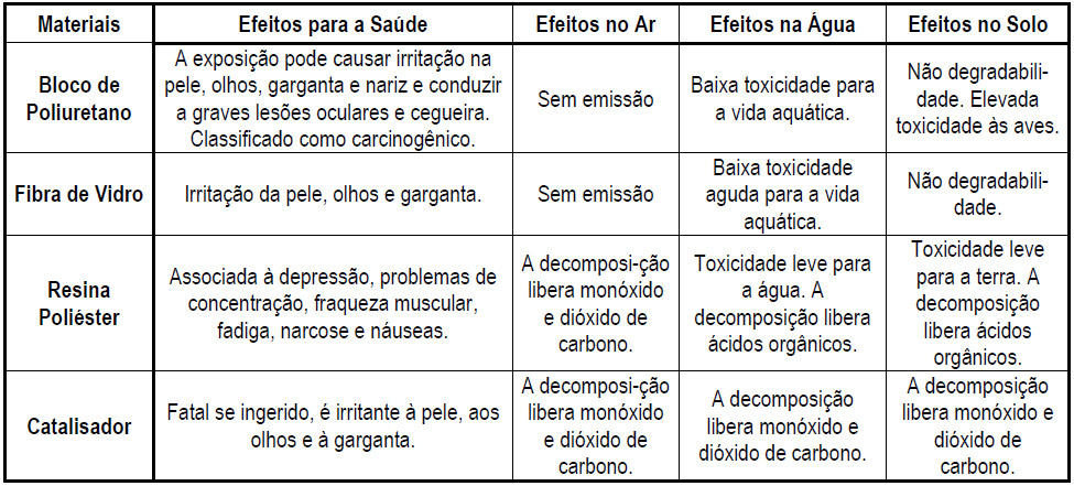 Os autores destacam, em face dos materiais utilizados na fabricação da prancha de surfe, quatro escopos que englobam os possíveis alvos dos impactos gerados nas atividades produtivas. O Quadro 1 permite constatar que os principais impactos da indústria são ocupacionais, em especial na fabricação de pranchas. A periculosidade destes resíduos está vinculada à inflamabilidade e ao fato de serem perfurocortantes. Quando o poliuretano (PU) sofre degradação térmica, químicos tóxicos podem ser emitidos. Mas na presença de chama ou temperaturas maiores que 800ºC, ocorre a formação do ácido cianídrico (HCN) e indivíduos expostos a este ácido e seus derivados podem ir a óbito (AMERICAN CHEMISTRYCOUNCIL, 2014). Em relação ao impacto sobre o solo e a água, importante mencionar o alto potencial poluidor dos resíduos de poliuretano, das resinas e das fibras.