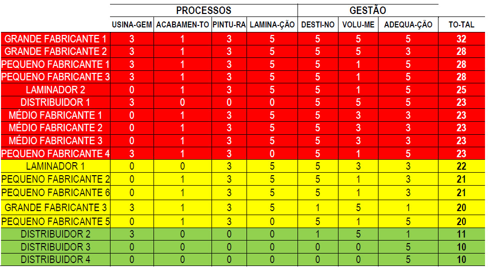 Nota-se quanto aos médios e pequenos fabricantes que suas médias na avaliação de desempenho estão entre 31% e 36%. Estes valores provavelmente são devidos a similaridades de elos executados. Apesar de todos os médios fabricantes e de 50% dos pequenos fabricantes verticalizarem os processos de acabamento, pintura e laminação potencializando a produção de resíduos, provavelmente estes apresentaram um melhor resultado na avaliação (média de 36%) por estarem legalmente enquadrados quanto à destinação dos resíduos sólidos. Os outros 50% da amostra dos pequenos fabricantes têm resultados de 32% e 33% possivelmente em razão de não atenderem às normas para eliminação dos resíduos sólidos.