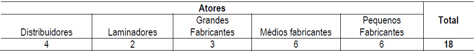 Quanto à amostragem, não havia informações e registros específicos disponíveis sobre o número de fabricantes e de distribuidores de material na cidade de Florianópolis. Assim, efetuou-se prévio levantamento, com o qual foram localizados trinta e cinco possíveis alvos de aplicação do mapeamento. A busca foi realizada por meio de anúncios em revistas especializadas, em redes sociais, jornais on-line e web search no período de março a abril de 2015. A amostra final foi de 18 empresas, considerando que das 35 inicialmente identificadas, algumas não foram localizadas, não responderam aos contatos ou não quiseram participar. A amostra apresentada na Tabela 1 estratifica os atores por categorias e subcategorias, como distribuidores, laminadores e fabricantes, classificados em grandes, médios e pequenos. Essa classificação se estruturou ao longo da pesquisa em razão das características observadas nas coletas de dados e são descritas nos resultados deste artigo. A Tabela 1 enumera as amostras escolhidas para coleta de dados.