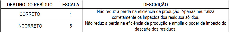 A escala de avaliação do destino dos resíduos está vinculada ao destino dado aos resíduos pelos atores. O destino apropriado é o aterro industrial. Outra forma qualquer de destinação aumenta o potencial de periculosidade dos resíduos descartados. A destinação somente pode ter duas possibilidades: correta, quando enviada ao aterro industrial; ou incorreta, quando da coleta municipal ou incineração. A escala para a destinação ficou descrita conforme o Quadro 3.