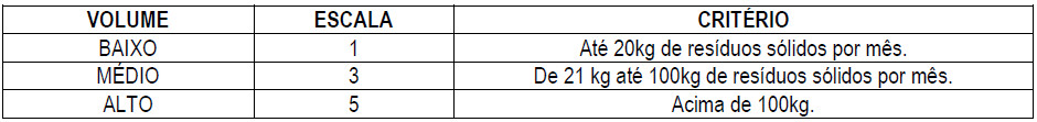 Apesar de este trabalho não ter um enfoque quantitativo, uma questão relevante e relacionada diretamente à destinação dos resíduos é a quantidade de resíduo produzida em cada elo e por cada ator envolvido, apontando o nível de impacto por ele proporcionado. A escala de volume de resíduo levou em consideração faixas de geração de resíduo e suas quantidades e propôs uma proporcionalidade às quantidades geradas em cada categoria, como mostrado no Quadro 4.