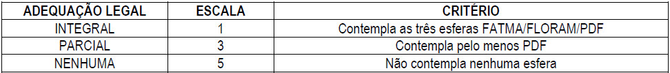O Quadro 5 aponta 1 ponto na escala para os atores que contemplem os três indicadores legais a serem atendidos, FATMA, FLORAM e PDF. Esse valor é definido de forma a não eliminar totalmente a pontuação inferida pela periculosidade dos elos realizados pelos atores. Três pontos são destinados aos atores que pelo menos cumprem a exigência de estarem localizados em áreas permitidas para as atividades conforme o PDF. O cumprimento dessa exigência permite a regularização do empreendimento junto aos órgãos fiscalizadores, FATMA e FLORAM. No caso de a localização do empreendimento do ator estar em área não regular, isto impede definitivamente sua adequação legal, agregando 5 pontos em suas avaliações.