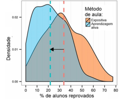 Assim, aprendizagem ativa ocorre quando o aluno interage com o assunto em estudo – ouvindo, falando, perguntando, discutindo, fazendo e ensinando –, sendo estimulado a construir o conhecimento em vez de recebê-lo de forma passiva do professor. Em um ambiente de aprendizagem ativa, o professor atua como orientador, supervisor, facilitador do processo de aprendizagem, e não apenas como fonte única de informação e conhecimento. Por estes motivos, na aprendizagem ativa, a retenção dos conteúdos pelos alunos tende a ser mais efetiva. Um estudo realizado por Freeman et al. (2014) apresentou este fato. A Figura 1 ilustra o resultado da pesquisa, apresentando que a média dos alunos reprovados tende a ser menor em disciplinas que fazem uso de estratégias de aprendizagem ativa do que naquelas que lançam mão apenas de aulas expositivas.