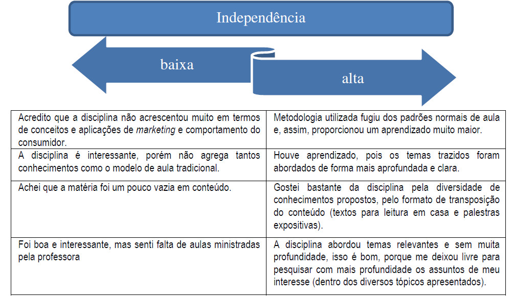 1. Os depoimentos apresentaram diferentes níveis de independência. Independência no sentido de autonomia para se buscar respostas por conta própria; de não se prender exclusivamente ao que o professor fala e sugere que se leia e faça. Godoy (1989) usa o termo “independência intelectual” para se referir a este construto. A Figura 2 ilustra as evidências extraídas do texto: