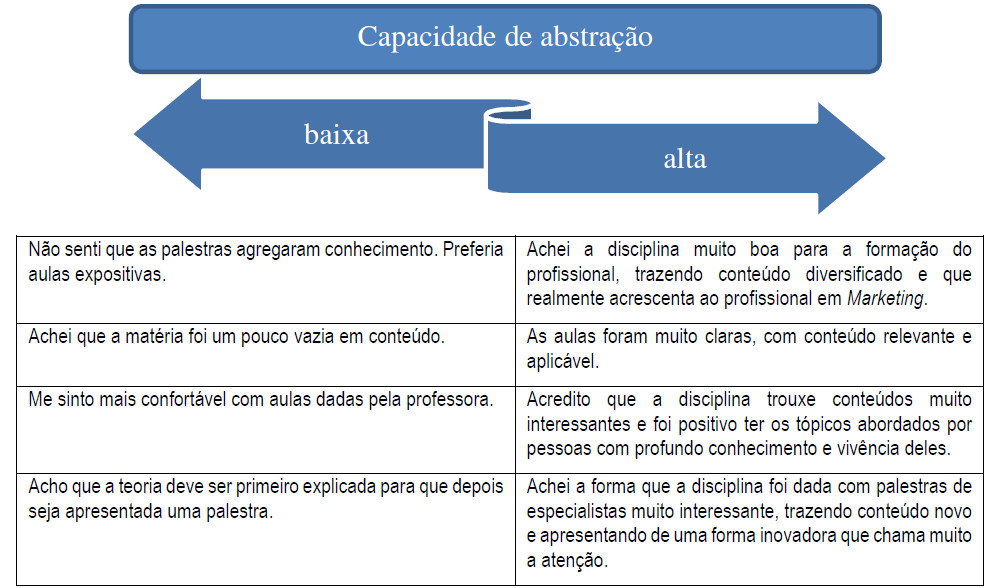 2. Os relatos individuais também evidenciaram diferentes níveis de capacidade de abstração, ou seja, a capacidade de compreensão de um dado conceito teórico e sua aplicação prática por profissionais de mercado. Este construto é apresentado pela Figura 3.