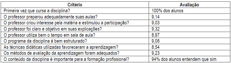 O desenvolvimento das aulas ocorreu de forma tranquila e a dinâmica pareceu funcionar bem para a docente, para os palestrantes e para os alunos. Também as avaliações no final do semestre indicaram uma opinião bastante positiva dos alunos em relação à disciplina. O Quadro 1 apresenta os principais indicadores obtidos. Como foram duas turmas, calculou-se uma média ponderada dos valores de cada sala. A avaliação varia entre 0 e 10.