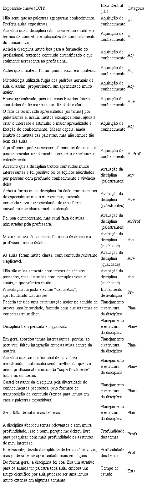 Antes de se buscar a construção do discurso coletivo, é interessante apresentar alguns aspectos gerais sobre os 52 depoimentos coletados. De modo geral, ambas as turmas consideraram a disciplina boa e interessante, com temas relevantes (“As aulas foram muito claras, com conteúdo relevante e aplicável”). Muitos alunos passaram a se interessar por novos temas que ainda não dominavam ou que conheciam superficialmente (“Passei a ter interesse em Sustentabilidade, Ética, Consumo Colaborativo e Vulnerabilidade do Consumidor, (...) extremamente interessantes as abordagens acadêmicas sobre os assuntos”). Também consideraram os instrumentos de avaliação justos e adequados, minimizando a necessidade de se decorar conceitos desnecessariamente ou de forma artificial (“A avaliação foi justa e evitou “decorebas”, aprofundando discussões”). O formato com palestras dividiu os alunos. Alguns acharam que a disciplina ficou dinâmica e interessante (“Acredito que um profissional de cada área ministrando a aula acaba sendo melhor do que um único profissional ministrando “superficialmente” todos os conceitos”); já outros alegaram que sentiram falta de aulas teóricas (“Senti falta de aulas mais teóricas”) e aulas ministradas pela própria professora (Foi boa e interessante, mas senti falta de aulas ministradas pela professora”).