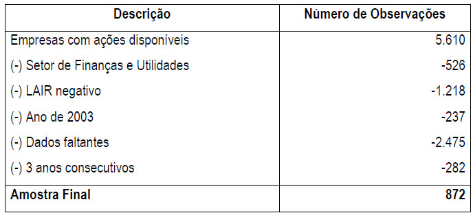 A amostra inicial do estudo é composta por companhias abertas brasileiras, somando 5.610 observações, coletadas na base de dados Thompson Reuters, do período de 2003 a 2015 (Quadro 1). Foram excluídas 526 observações dos setores de finanças e utilidades, a fim de reduzir a complexidade das variações devido a regulações nos relatórios financeiros. Em seguida, foram excluídas 1.218 observações com lucro antes do imposto de renda (LAIR) negativo. Segundo Hanlon (2005, p. 144), “os prejuízos fiscais podem se transformar em ativos fiscais diferidos, cujas alterações podem obscurecer os efeitos da “verdadeira” book-tax differences na conta de despesa fiscal diferida”. Foram também excluídas 237 observações do ano de 2003, utilizado apenas para cálculo das variáveis defasadas, e 2.475 observações com BTD faltante. As empresas que não tinham pelo menos três anos consecutivos de dados para o cálculo da persistência (282 observações) também foram excluídas. A amostra final é constituída por 872 observações no período de 2004 a 2015.
