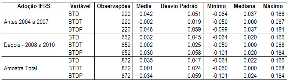 A estatística descritiva segregada por período pré e pós adoção das IFRS é ilustrada na Tabela 1. Percebe-se que a média da BTD e da BTDP diminuiu após a adoção das IFRS e que a média da BTDT mudou de negativa para positiva. Esse resultado é inesperado, uma vez que, após a adoção das IFRS, espera-se maior desvinculação entre a contabilidade societária e fiscal.