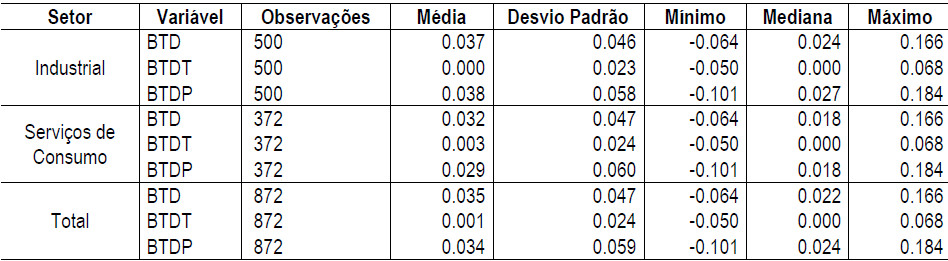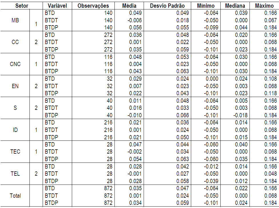 Na Tabela 2, é exibida a estatística descritiva por setor de atividade. Os setores que evidenciaram maior BTD foram o de Materiais Básicos (MB), de Consumo não Cíclico (CNC) e Tecnologia (TEC). E aqueles com menor BTD foram Saúde (S) e Indústria (ID). Alguns setores expuseram BTDT negativa, enquanto outros positiva. Esses resultados decorrem da oscilação no número de observações por setor. Inclusive, em alguns setores, o número de observações é muito pequeno. Wahab e Holland (2015) enfrentaram o mesmo problema e resolveram a questão, agregando os oito setores de atividade em apenas duas categorias: Industrial e Serviços de Consumo. Para efeito de comparação, essa classificação também será realizada nesta pesquisa, sendo os setores classificados em: 1 – Industrial e 2 – Serviços de Consumo (Tabela 2).